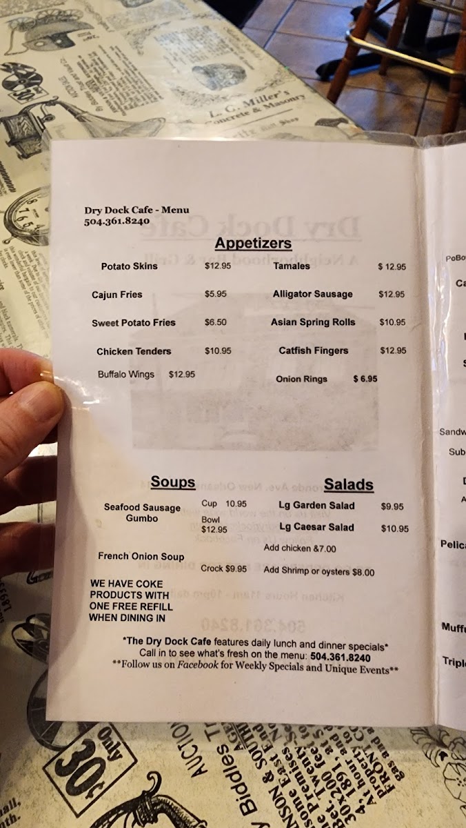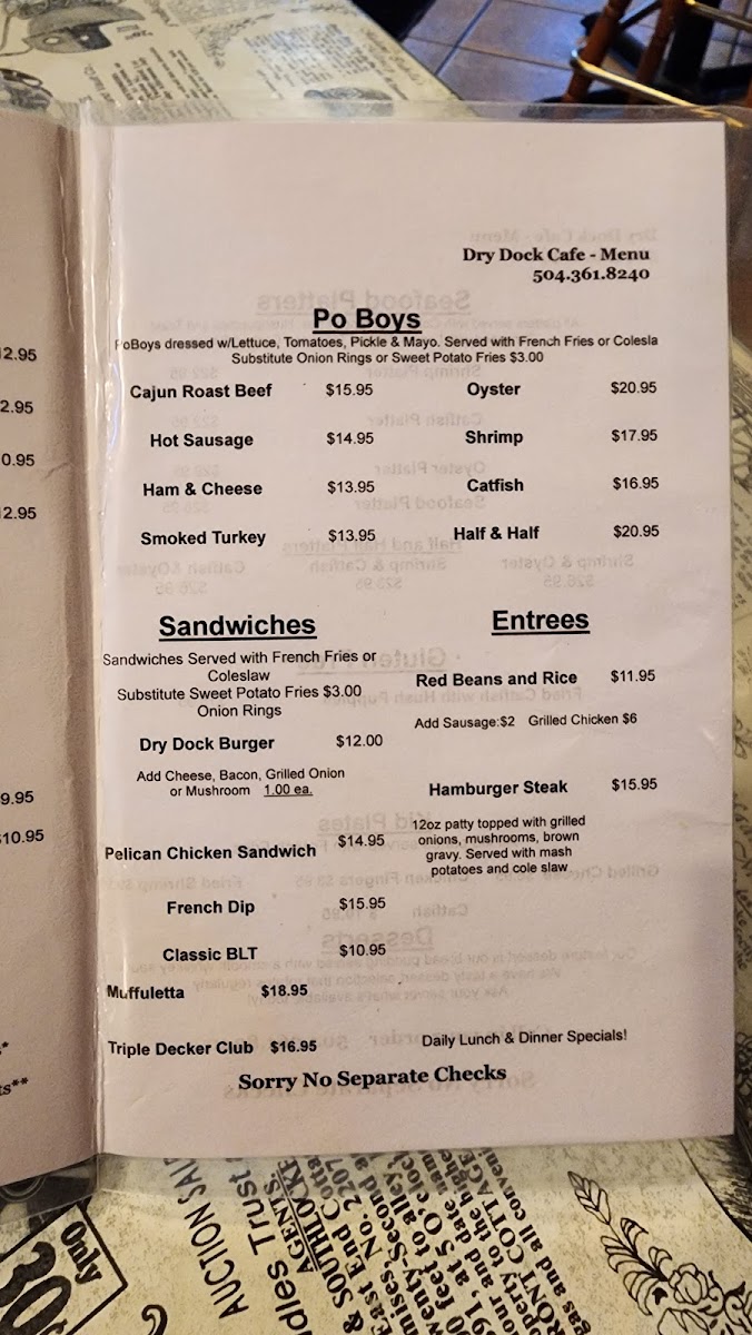 Welcome to Dry Dock Café, a charming bar and grill nestled in the heart of Algiers Point, New Orleans. This hidden gem offers a delightful menu that showcases the rich culinary traditions of the region. Start your meal with a bowl of their renowned Seafood Gumbo or Shrimp Bisque, both brimming with flavor and character.